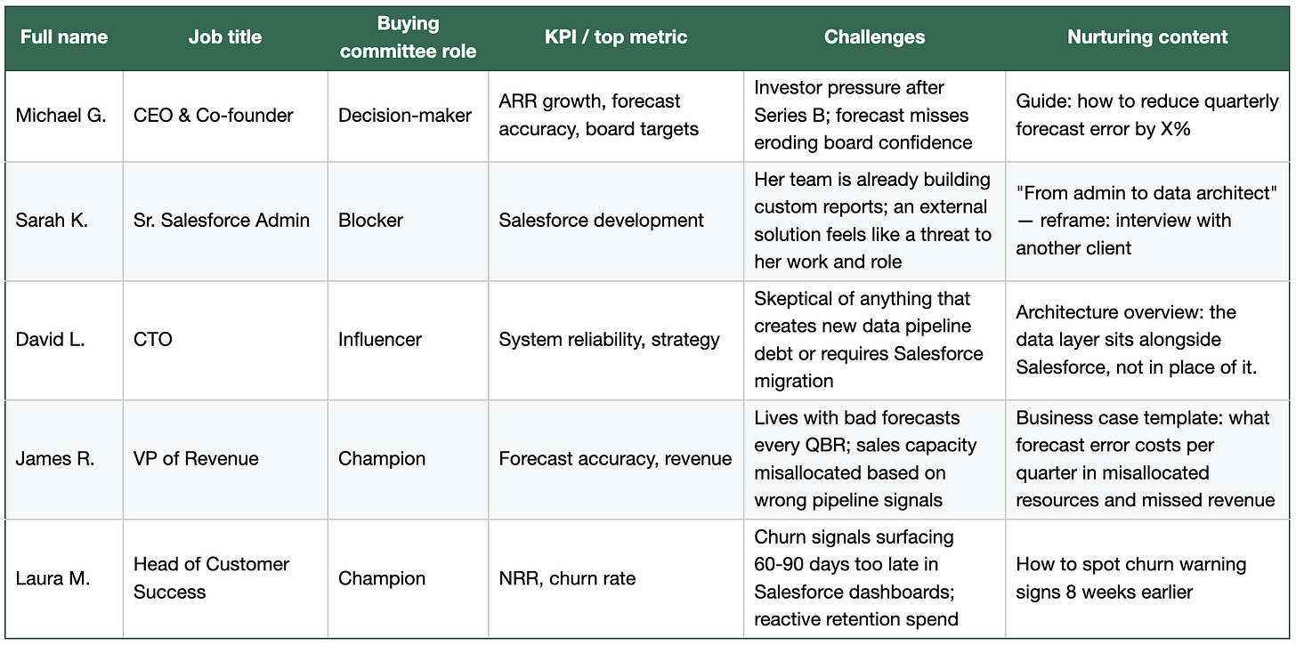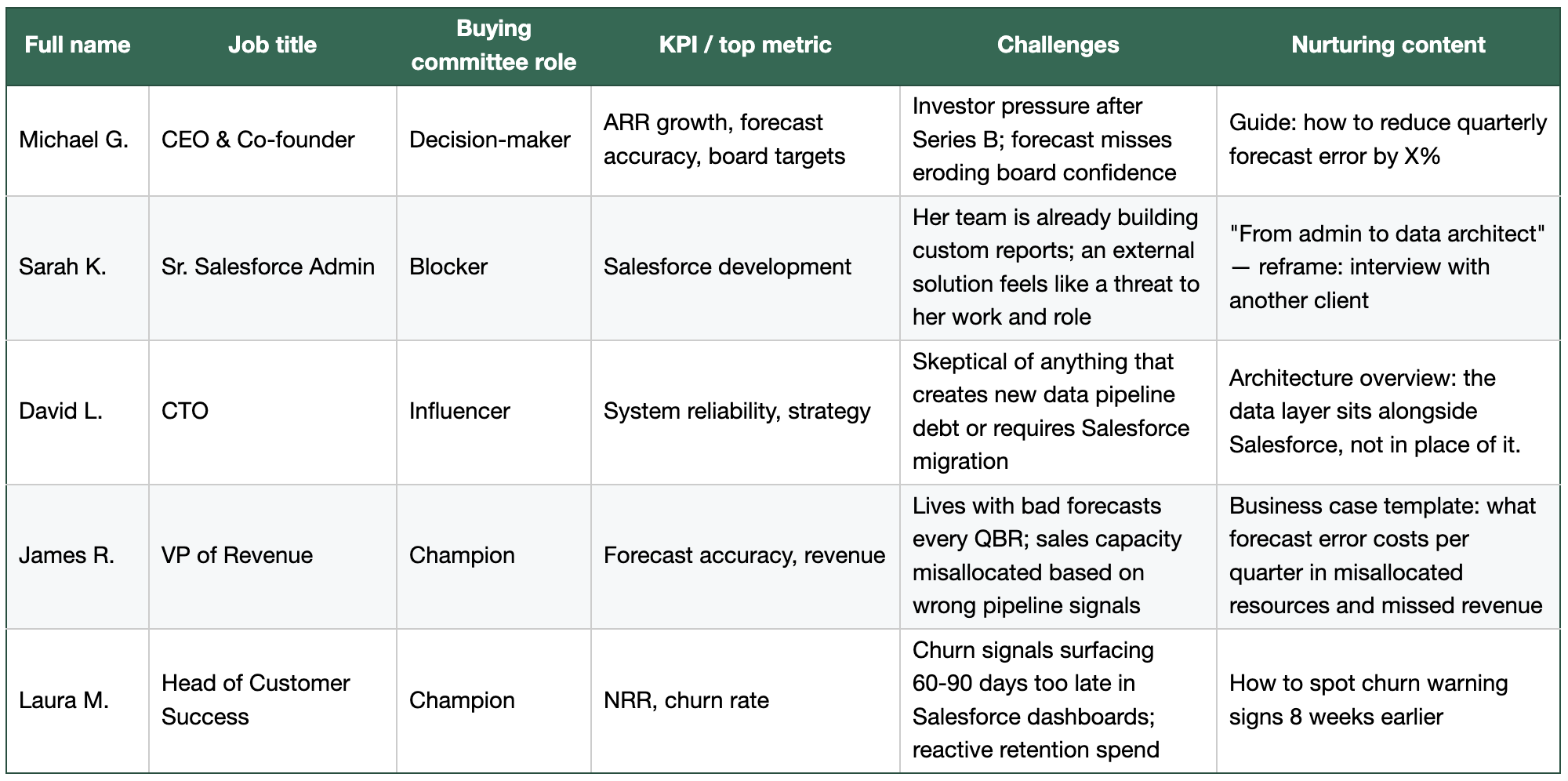 You brainstorm here what content might challenge the status quo, seed the grain of change, and address the challenge this person is accountable for. For example, James R. doesnât need a platform overview and map of data layering on top of Salesforce. He needs a document he can bring to the next QBR that justifies investigating a change.