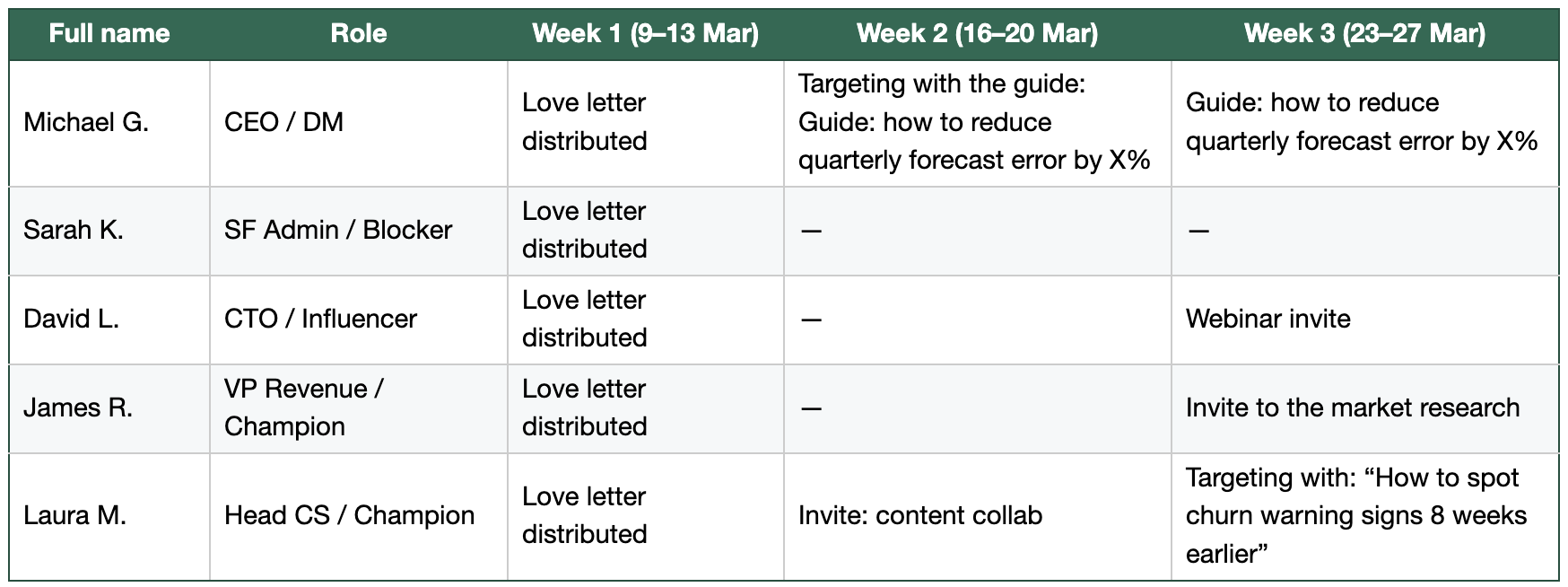 Add to your account plan the week-by-week engagement strategy.