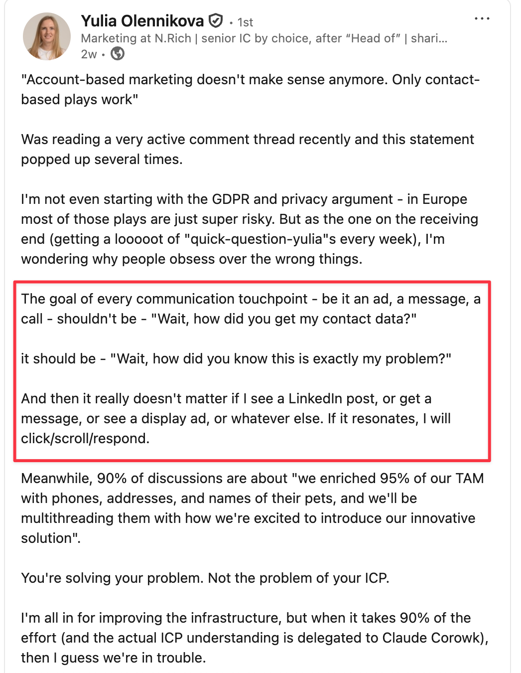 The real problem I see is that people who write these comments, probably, have never done a proper ABM. They donât know that ABM happens both on account and contact level. If you donât connect buyerâs priorities to account priorities, you simply would drive the wrong POV (point of view).