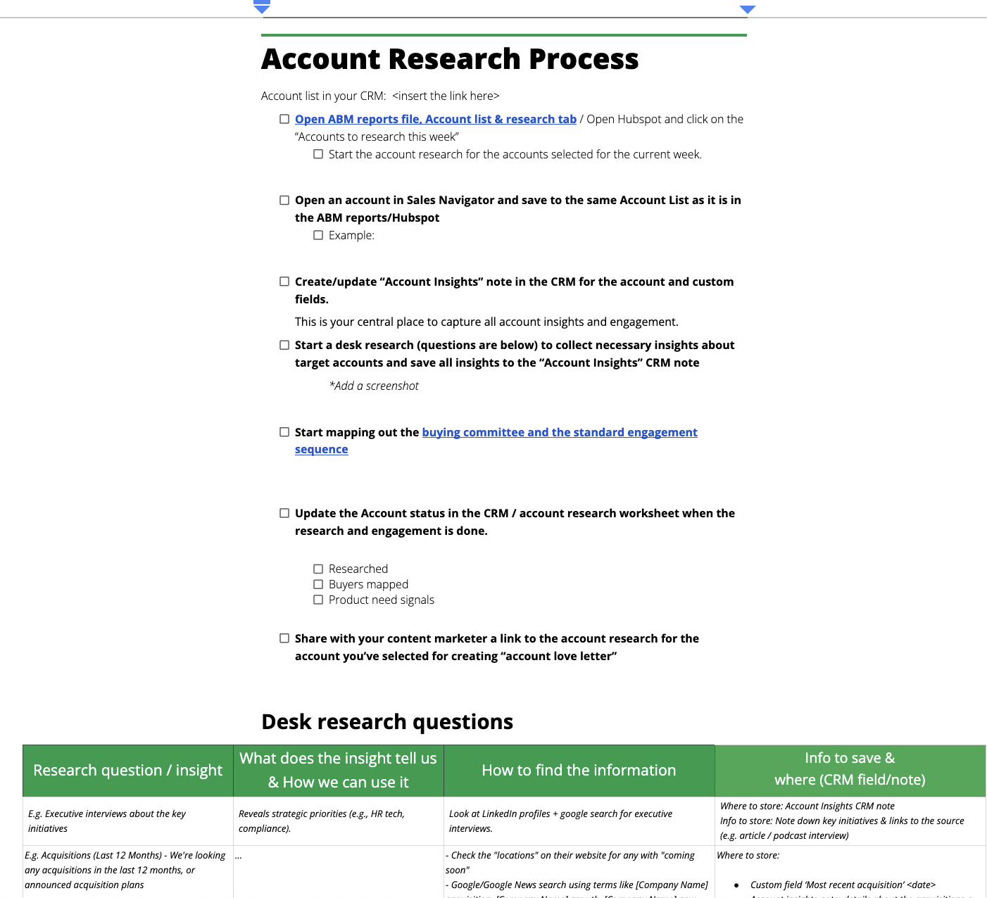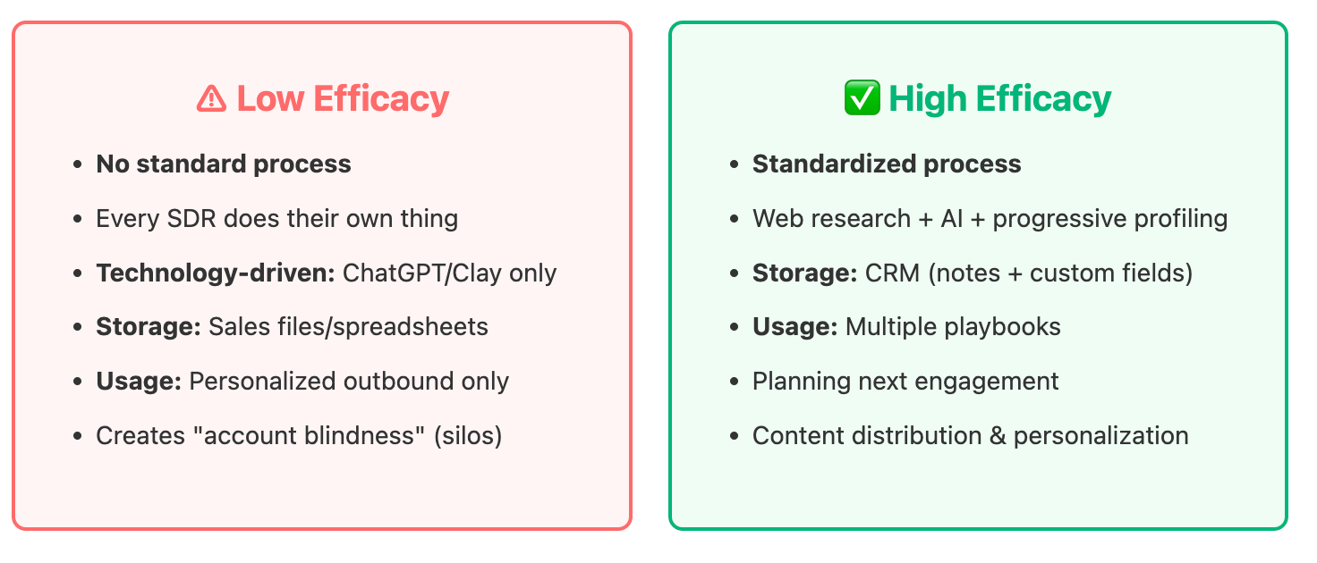 2. Account research: Create standardized processes that capture insights to plan engagement, not just personalize first lines