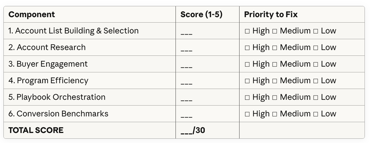 I promised in the beginning to share how to use the ABM audit scorecard. The first step you need to take is to rate your program on each component we covered in the article (1-5 scale):