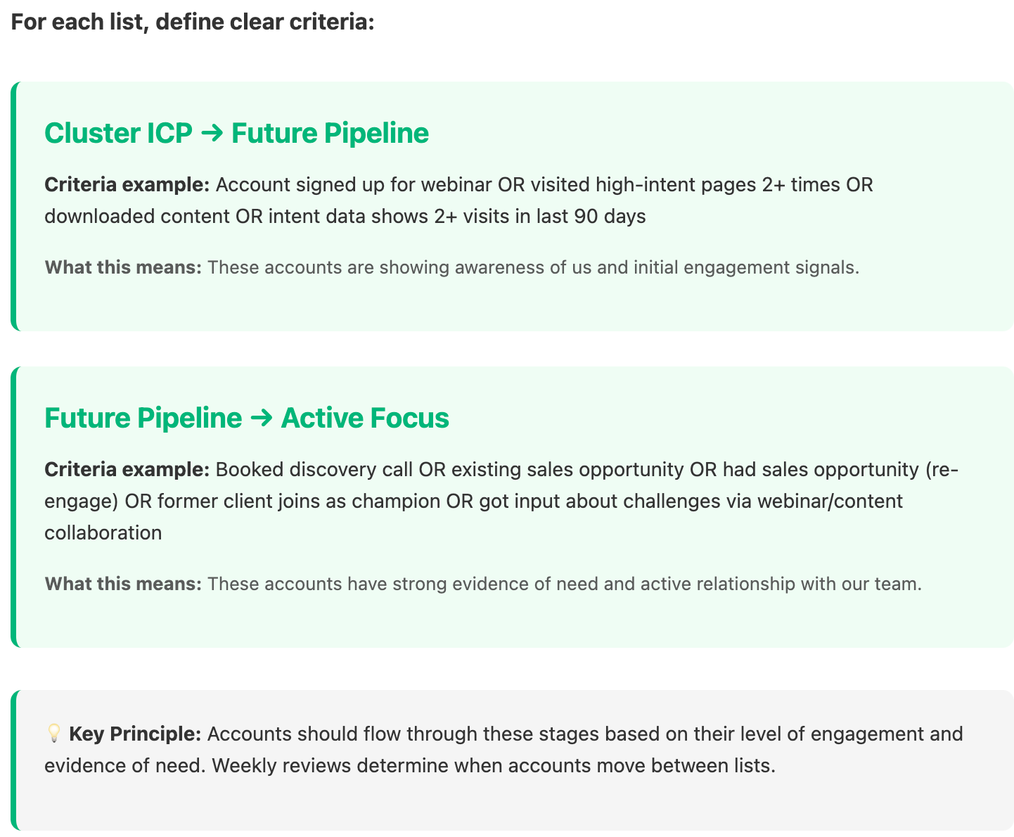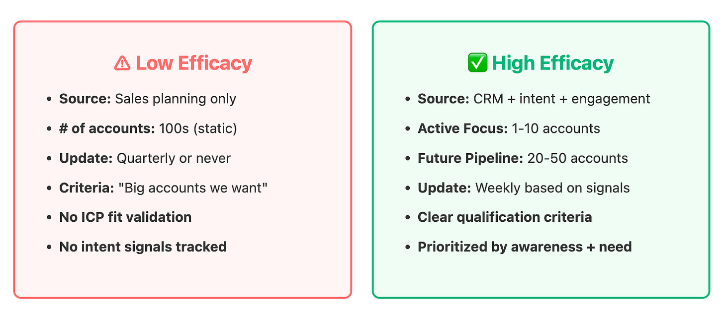 These lists are big, static and are not reviewed until the next sales planning. They completely ignore intent data, account engagement and signals. All accounts are engaged the same way unti the discovery call is booked.
