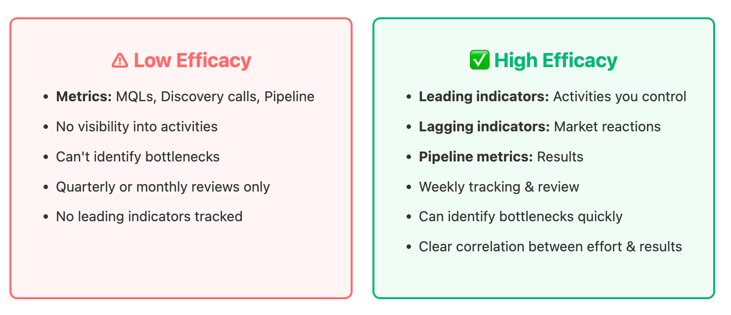 4. Program measurement: Track leading indicators (activities you control) and lagging indicators (market response) weekly, not just pipeline monthly